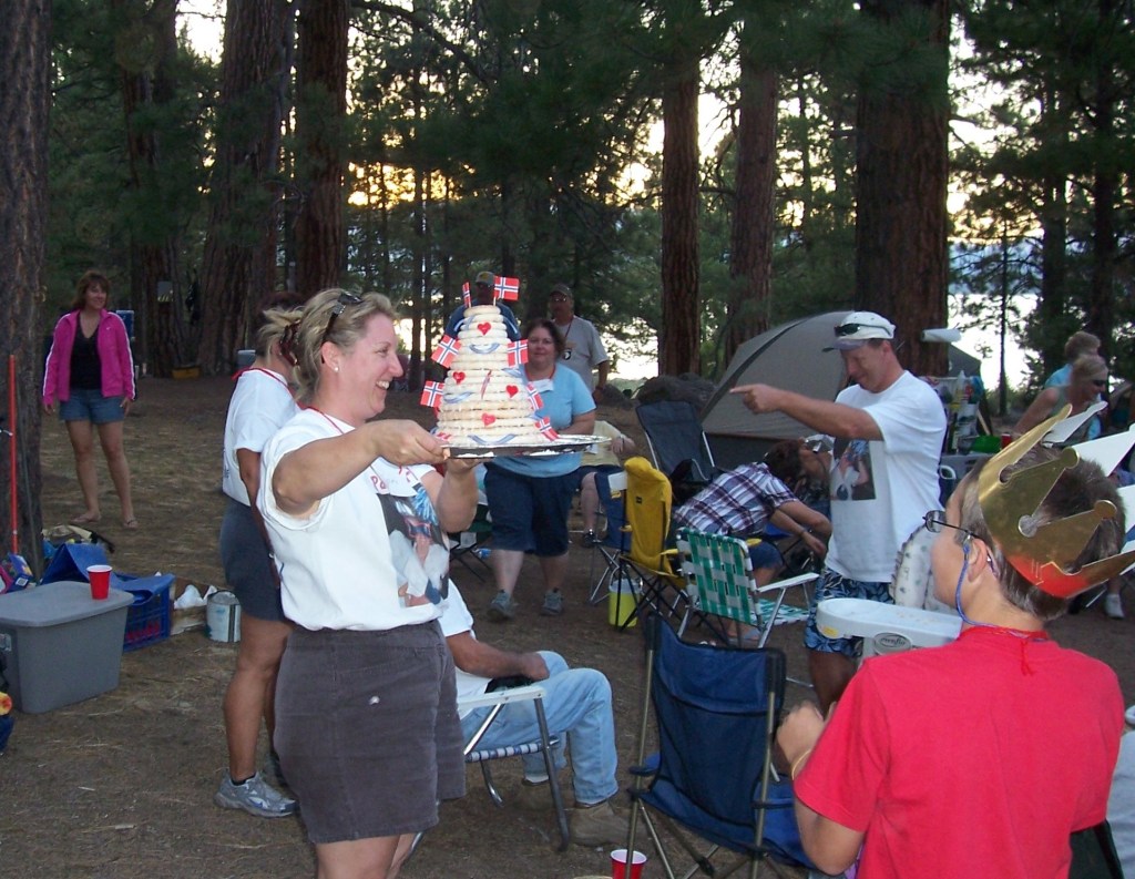 The above picture was Mom’s 75th Birthday Celebration . . at Eagle Lake, CA – August 2006. Catering at campgrounds with NO running water? . . only for my mom . . and a kransakake to boot!